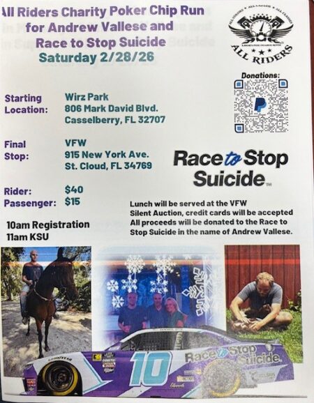 All proceeds from the All Riders Charity Poker Chip Run for Andrew Vallese will be donated to Race Stop Suicide. And it will be donated in Andrew’s name.